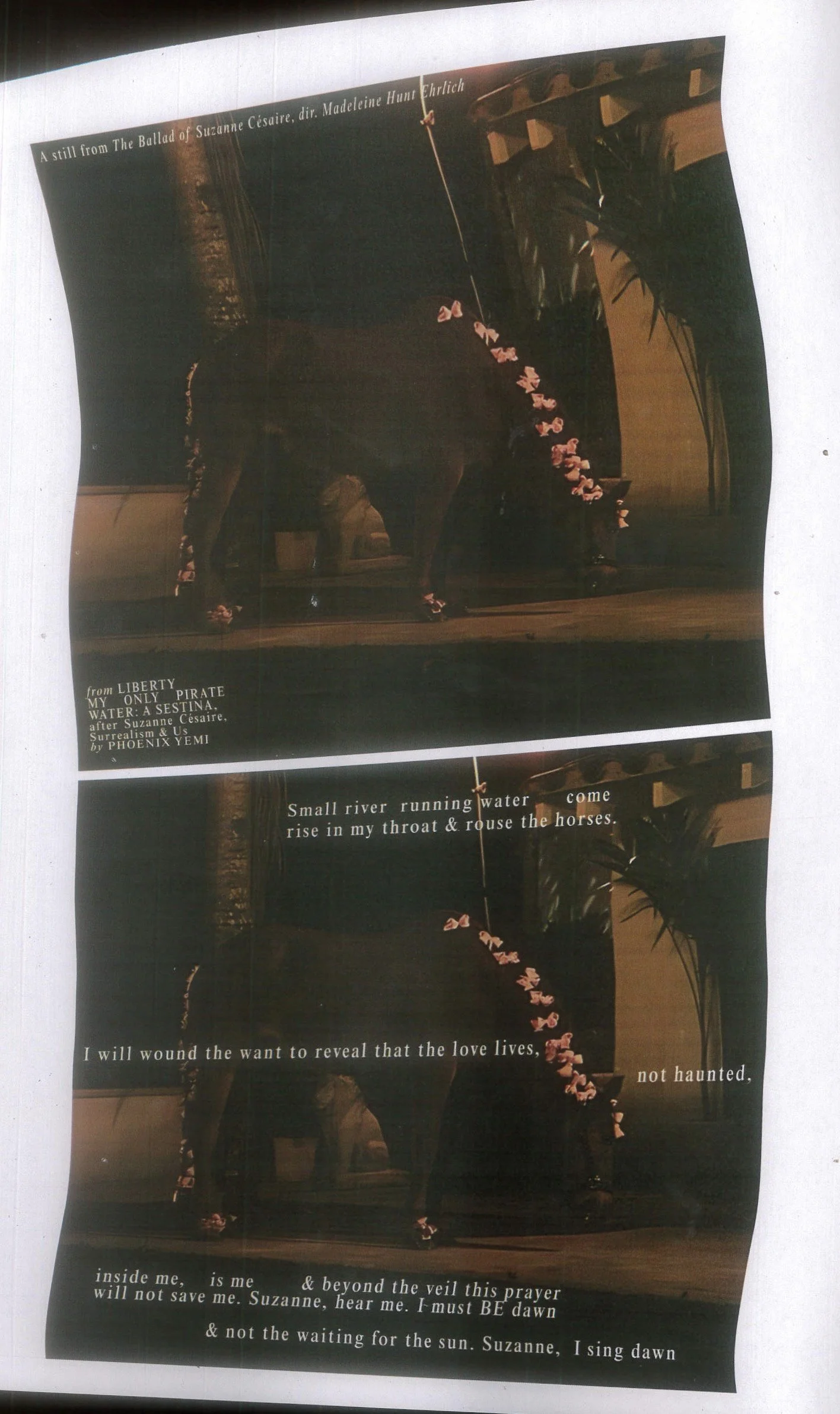 One of the images that stayed with me was a horse dressed in dozens of pink bows. It took me back to the poem I wrote for Worms #9: The Psychoanalysis Issue. Here’s a fragment from it below. Click here to read the poem in its entirety.