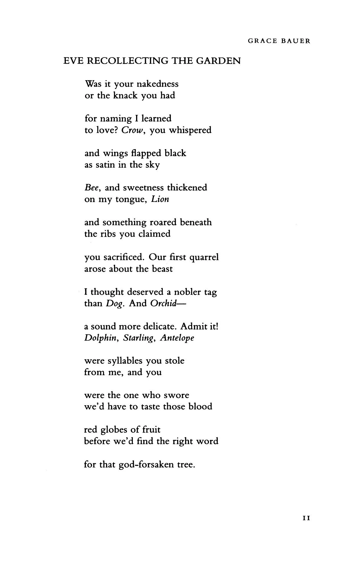 The terror and the beauty of the garden. Adam and Eve, Eden, and the old suggestion of woman as shaped from the rib of a man. No! I refuse it, and put forward this poem by Grace Bauer instead.
